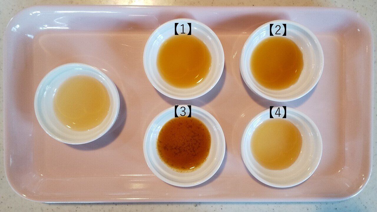 見た目では、【3】の色が一番濃く、次いで【2】【3】の順になっています。白だしに一番色が近いのは【4】ということになりました。