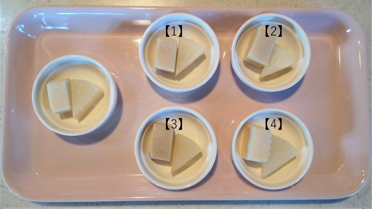 仕上がりの色は、白だしが食材そのままに近い色なのに対し、同じようなものは【4】のみという結果になりました。【3】が一番濃く、高野豆腐が強く黒ずんでいるのがわかります。それに次いで、【1】、【2】もやや黒ずみが見られます。また、大根については高野豆腐ほどではありませんが、同じ順でわずかに変色が確認できます。