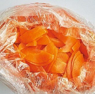 ●ポリ袋の口をとじるときは、空気をしっかり抜いて、材料のすぐ上の部分から袋をねじってひも状にし、根元で輪っかを作り、そのすぐ上の部分を輪に通して引っ張ると、通した部分が輪っかになってギュッと結べます(引き解け結び)。開けるときは、袋の口を引っ張ればスルッとほどけます。