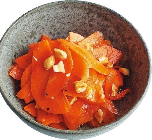 塩にんじん全量をざるに上げて水けをきり、酢大さじ2、オリーブ油大さじ1、砂糖大さじ1/2、(好みで)砕いたピーナツ適量を混ぜる。