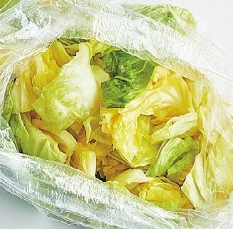 しばらく漬けて野菜の水分が抜けてかさが減ってきたら、袋の空気を抜いて口を結び直すと密閉状態になり、おいしく漬かる。
