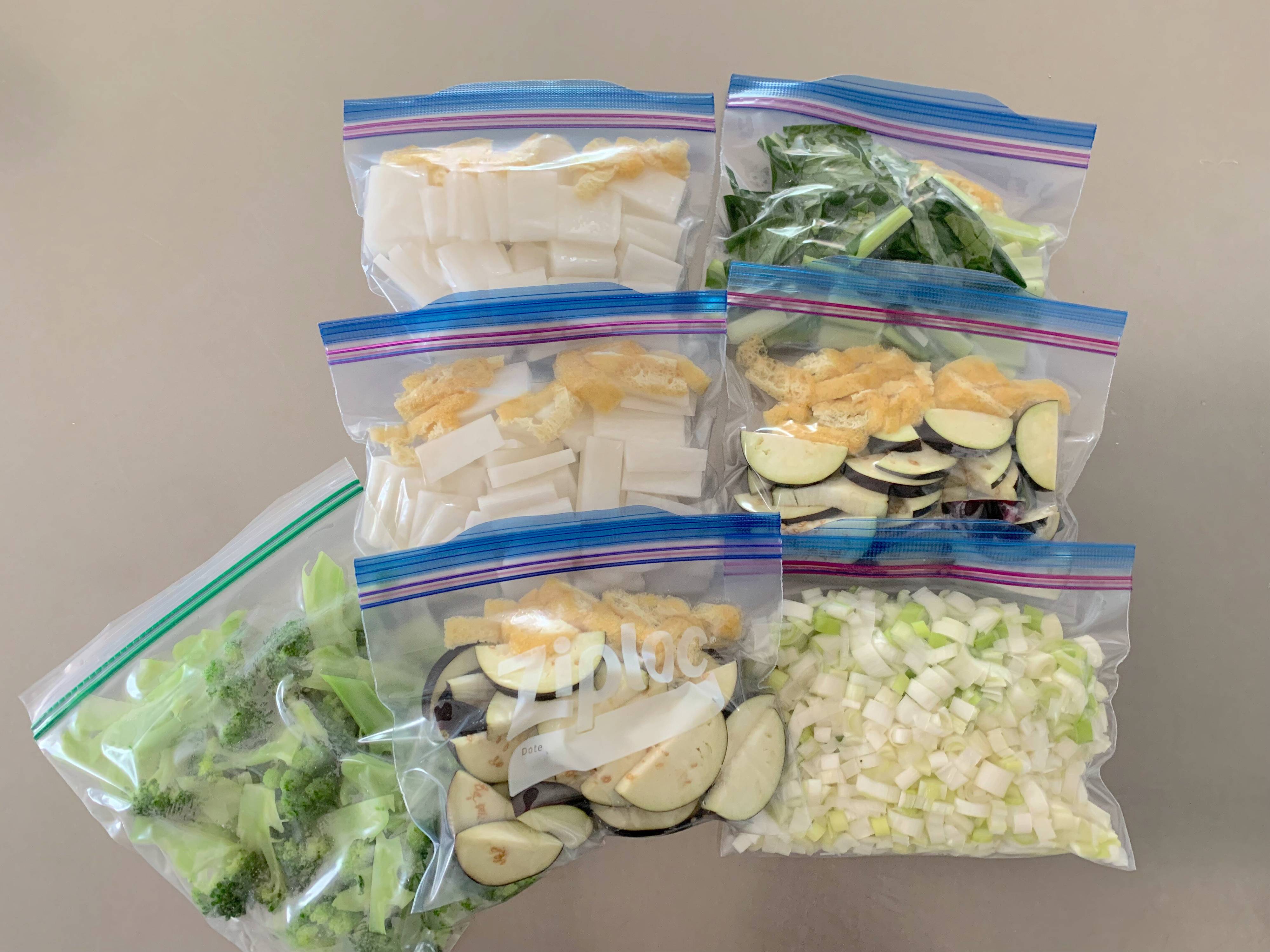 買ってきた食材を下処理する時に、みそ汁用に少しずつ分けて冷凍保存しておきます。野菜と油揚げなどをセットにして保存袋に入れておけば、鍋に入れるだけでみそ汁がつくれます。ねぎも刻んで冷凍しておくと便利です。