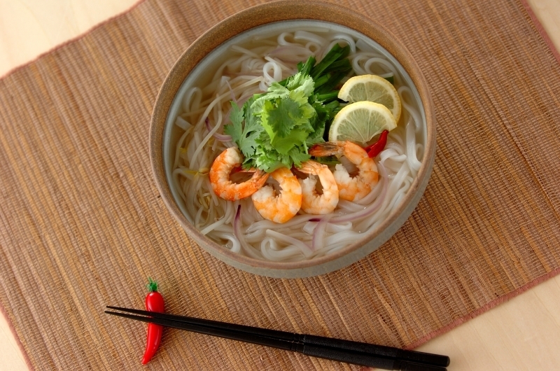 エビのフォーは、さっぱりしたエスニック風味の味つけがお好みのかたにおすすめでしょう。えびのだしや独特の風味を持つナンプラーなどが入ったスープに、酸味のあるレモンを合わせます。
