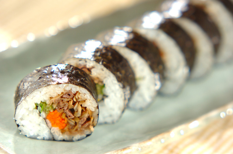 ゴボウと牛肉のしぐれ巻きは、甘辛い牛肉のしぐれ煮を巻き寿司の具にした、ボリューム満点の太巻きのレシピです。