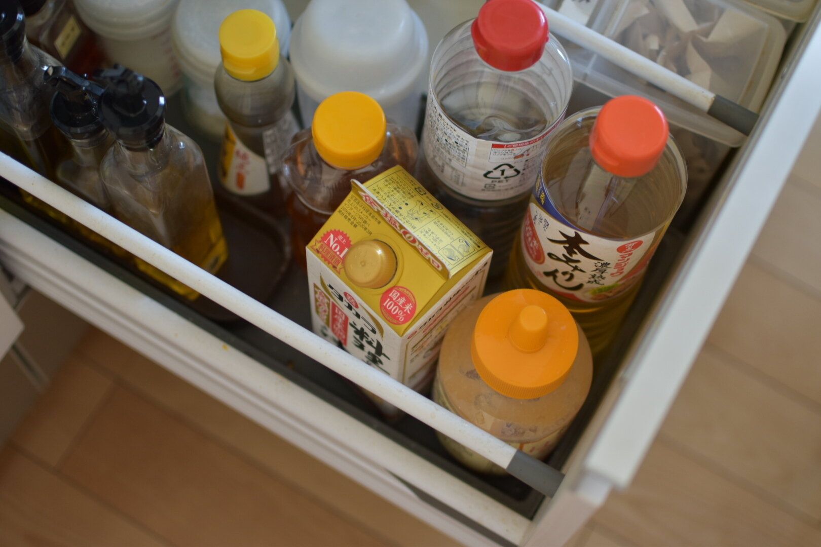 塩や砂糖など別容器へ詰め替えたほうが使いやすい調味料もありますが、それ以外は詰め替えをやめたほうが容器を洗う必要もなくなるうえに衛生的。使い終わったあとは、片づけやすい位置に保管すればキッチンまわりのスッキリ感を保つこともできます。