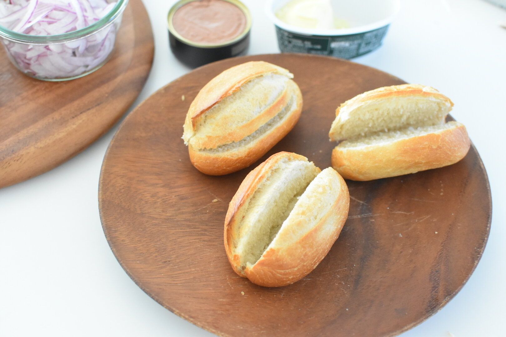 パンに対して斜めになるように切り込みを入れてもいいですが、ホットドックのように直角に切り込みを入れてパカッと開くようにすると具材がよく見えてはなやかな印象になるので、食べやすい方法で切り込みを入れてみましょう。