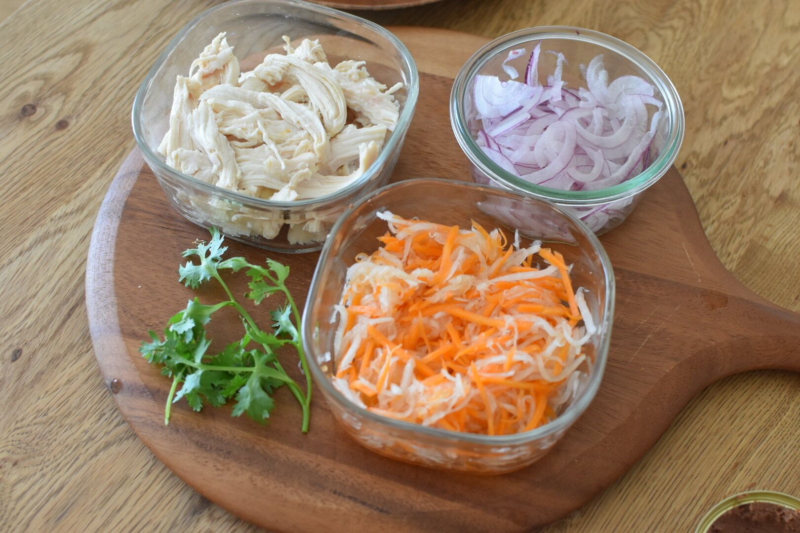 2.大根とにんじんのなます、鶏ハム、パクチーやうす切りしたレッドオニオンなどの好きな具材をはさみ、お好みでナンプラーを垂らす