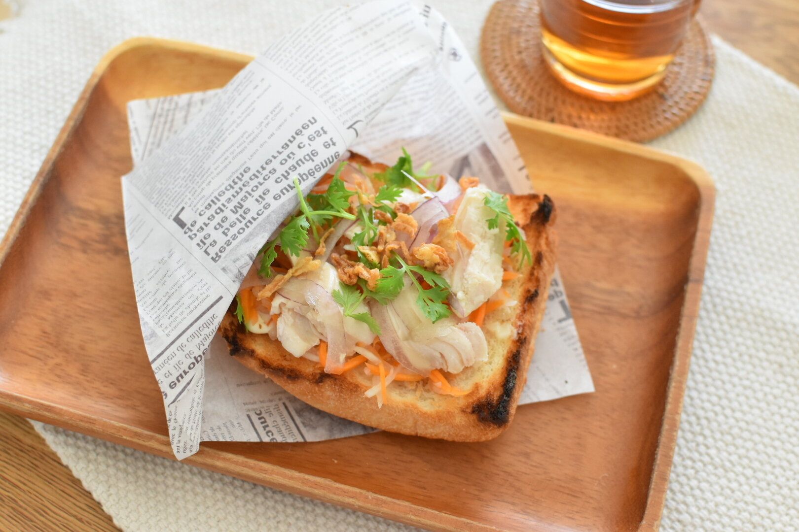 食パンを使って手軽につくれるバインミー風のトースト。ほどよい塩気と酸味の組み合わせがおいしい一品。ビールにも合うのでおつまみ代わりにもおすすめです。はさまないタイプのバインミーもおもしろいですね。