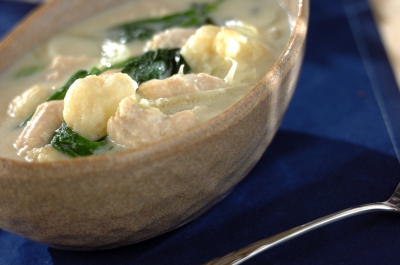 淡白な味わいのタラとカリフラワーをつかったやさしい味わいのスープです。豆乳ベースのクリーミーなスープで、朝食がわりはもちろん、パスタなどの洋食と合わせてもオススメです。