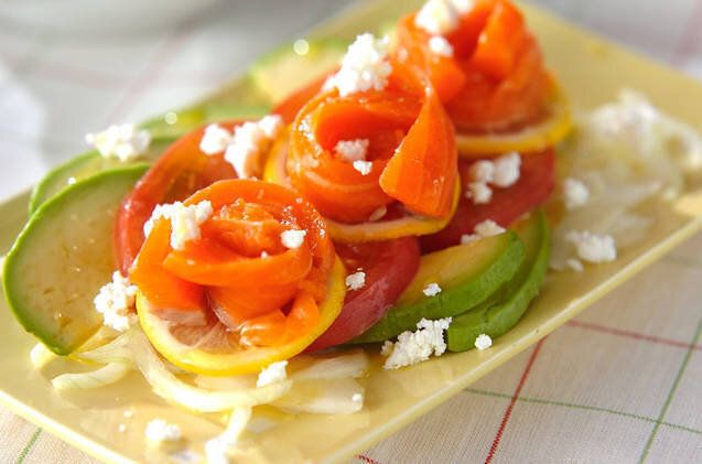 お店で出てくるような華やかな前菜が、自宅で簡単につくれるレシピです。サーモン・アボカド・トマトの鮮やかな色合いや、花のような飾りつけが食卓をおしゃれに演出してくれます。サーモンに塩気があるので、味つけはシンプルでOKです。