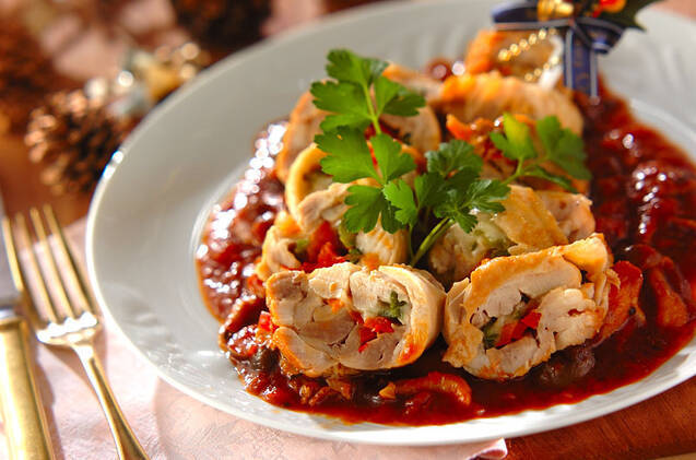 パーティーメニューのメインにぴったりの、ロールチキンのトマト煮。約30分でつくれます。ピーマンやパプリカも使って彩り豊かに!圧力鍋を使うので、柔らかなお肉の味わいを堪能できそうです。