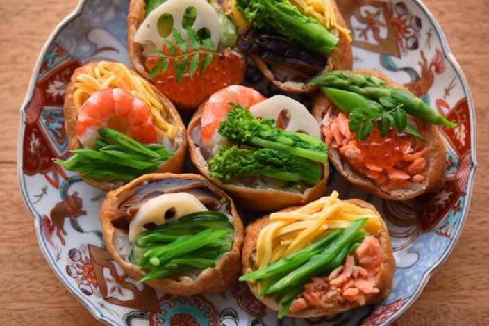 いつものいなり寿司を酢飯を上にして色鮮やかな具をのせるだけで、パーティーにもぴったりな華やかな具だくさんいなり寿司に大変身します。