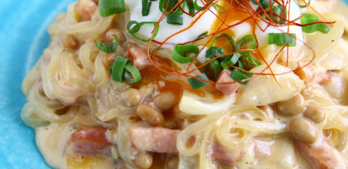 こちらはなんと、パスタの代わりに乾燥しらたきを使ったヘルシーなカルボナーラのレシピです。厚切りベーコンや玉ねぎ、卵に納豆と使う食材のボリューム感をアップさせることで、おいしく満足感も得られます。お好みで海苔をかけてもおいしくいただけますよ!
