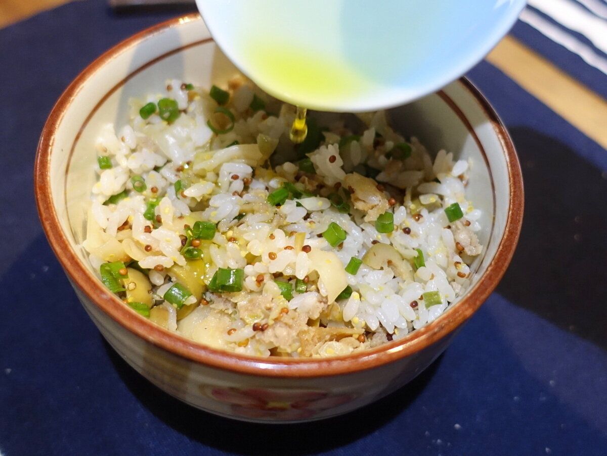 まずは餃子をレンジで温め、細かく刻みます。これを茶碗1杯の温かいご飯と混ぜます。ほかの具材は刻んだオリーブに万能ネギ。味つけはほんの少しの醤油と大さじ1の粒マスタード。食べる直前にオリーブオイルをかけてください。