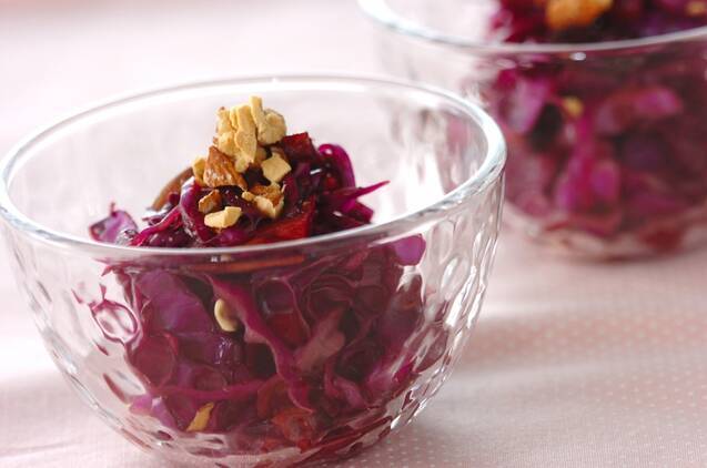 ドレッシングの爽やかな酸味と、リンゴやレーズンの甘さが相性抜群です。見た目も味もおしゃれに仕上げた一品です。レシピではバルサミコ酢を使用していますが、バルサミコ酢がなければ、お好みのお酢を使ってつくってみましょう。