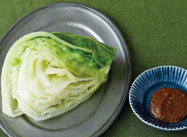 キャベツは縦に半分に切ってしんを切り落とし、葉が重なったまま洗う。軽く水をきって1切れずつラップで包み、電子レンジで4~5分加熱する。柔らかくなったらラップで包んだままさます。小鍋にAを入れて弱火でさっと煮て、とろみがついたらごまを混ぜる。キャベツを器に盛り、ごまみそだれを添える。(熱量52kcal、塩分0.6g)