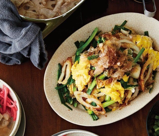 2のフライパンにサラダ油大さじ1をたしてちくわを入れ、こんがりとした焼き色がつくまで中火で炒める。にらを加えてさっと混ぜ、しょうゆをからめる。2の卵を戻し入れてさっと混ぜる。器に盛り、削り節をふる。 (熱量154kcal、塩分1.6g)