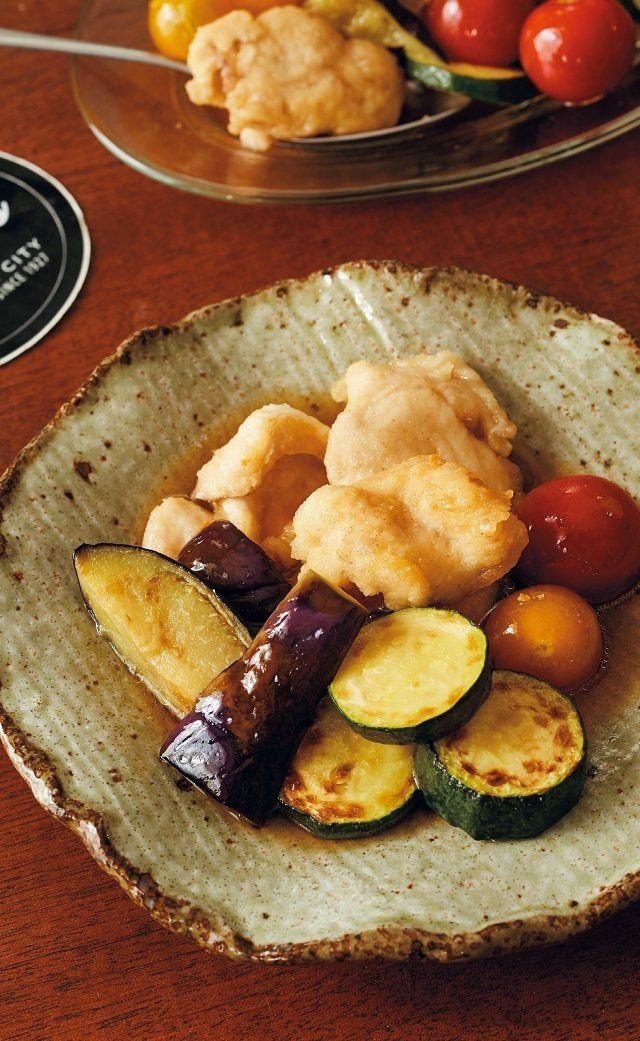 なすは長さを半分に切って縦に四つ割りに、ズッキーニは厚さ7㎜ の輪切りにする。プチトマトはへたを取り、楊枝で数カ所を刺す。鶏肉はそぎ切りにして塩、こしょうをふり、片栗粉をまぶす。