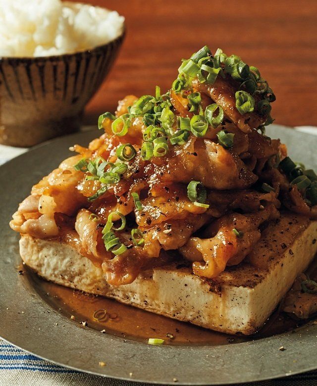 豆腐はペーパータオルで水けを拭く。豚肉は幅3㎝に切り、片栗粉をまぶす。フライパンにサラダ油小さじ3を中火で熱し、豆腐を入れて焼く。焼き色がついたら裏返し、両面焼いて器に盛る。