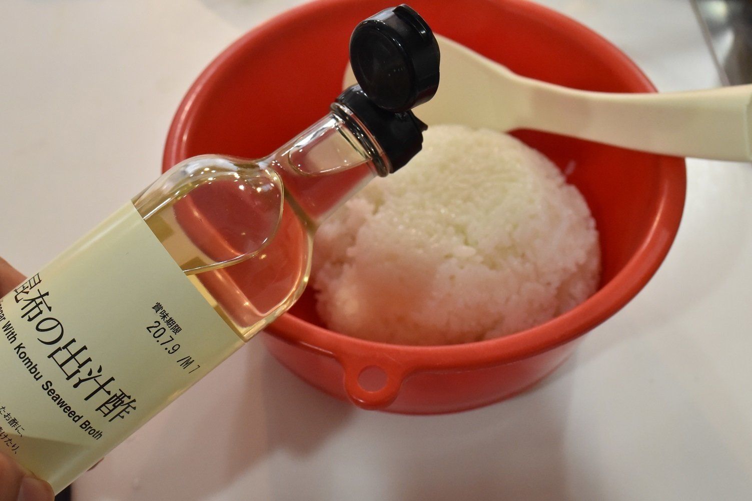 原材料は「醸造酢、砂糖、昆布だし、りんご酢、食塩、かつおだし」と、とってもシンプル。そのまま舐めてみると、市販のすし酢よりも塩味が少なく、甘味が強いです。出汁の味が効いていて、酢のツンとした匂いがありません。