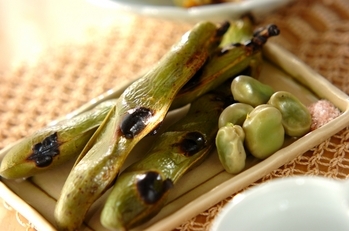 サヤのままのそら豆を、焦げ目がつくまでグリルで焼くだけのとっても簡単な料理です。下準備の手間や調理器具を使うこともないため、便利です。