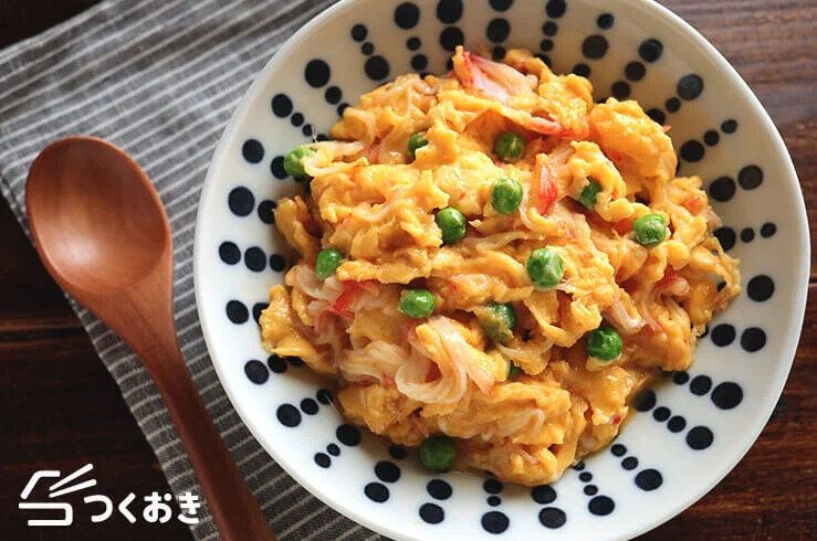 お財布にやさしいカニカマをたっぷり使った、ボリューム満点なカニ玉丼。材料を混ぜてフライパンで5分焼くだけと、あっという間につくれちゃうのもうれしいですね。とろっとしたあんをかけて、天津飯にアレンジするのも◎。
