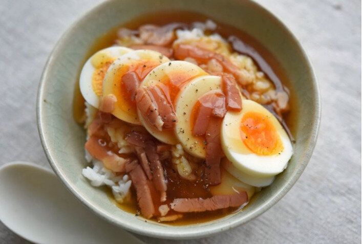 冷蔵庫の残りものを一掃したいときにぴったりなのが、こちらのお肉や野菜、キノコなどをたっぷり入れて煮こんだ、スープじたての丼もの。やさしい味わいのスープでさらさらと食べられ、食欲がわかない日のご飯としてもおすすめです。