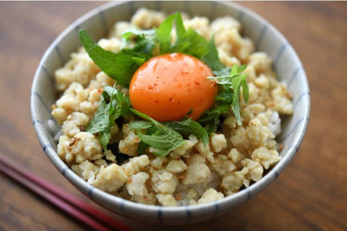 坦々麺の上に乗っているひき肉を、ご飯に乗せて丼にしたアレンジレシピ。山椒とラー油の入ったピリ辛ダレが、ご飯と相性バツグン!パンチが効いた味で、男性ウケもよさそうです。生卵をのせてマイルドな味わいに味変するのも◎。