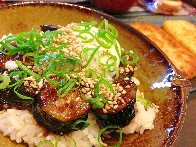 ナスを炒めてご飯にのせるだけのシンプルな丼レシピ。ナスにからんだ、ショウガのきいた甘辛いタレが食欲をそそります。とろとろのナスとシャキシャキのネギ、ぷるぷるの温泉卵といった食感のちがいも楽しめる一品です。