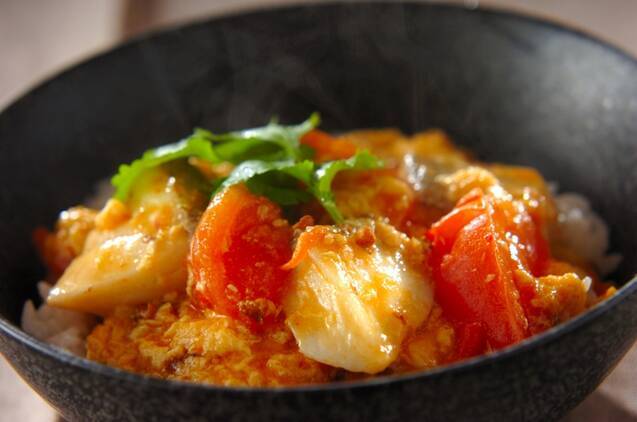 ピリッとした花椒(ホアジャオ)の辛さがやみつきになる中華風の丼ものです。卵の甘さで辛みがマイルドになり、味のバランスが整えられます。トマトとタラの組み合わせで、ヘルシーなのに満足感も◎。