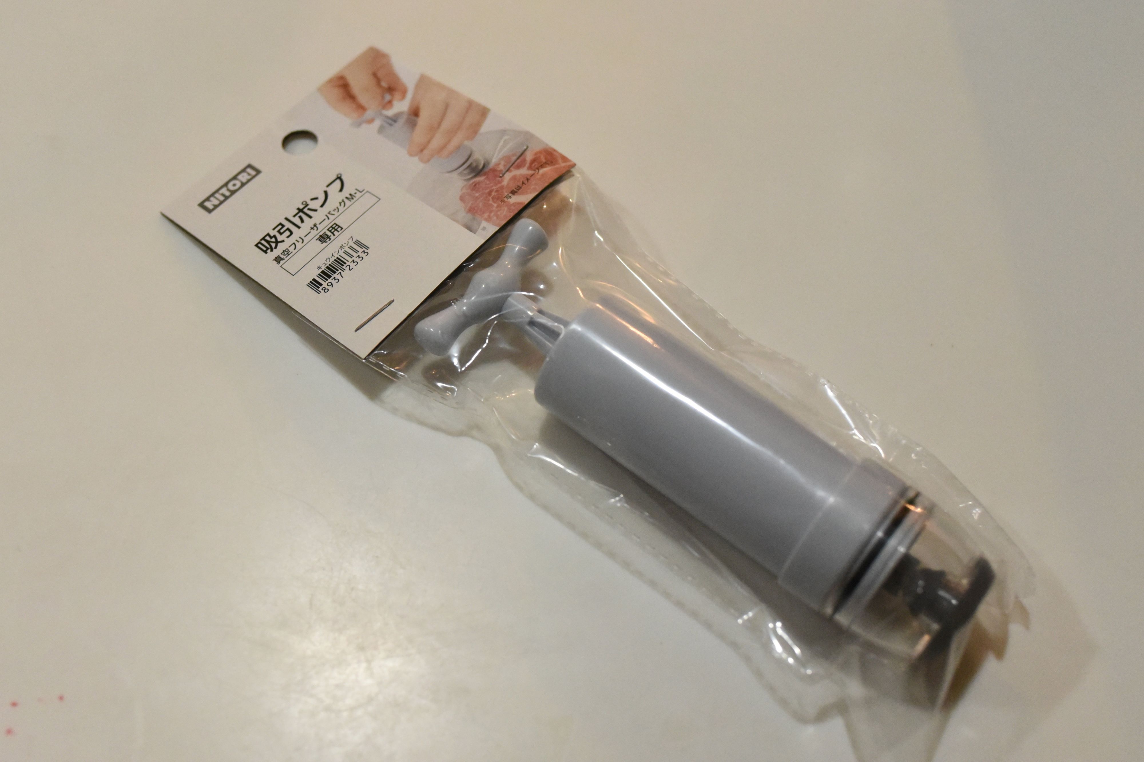 このパックを使ううえで欠かせない相棒が、いっしょに販売されている「吸引ポンプ」(¥185円・税別)です。これがないと真空パックの本領が発揮できないので、忘れずに購入するようにしてください。