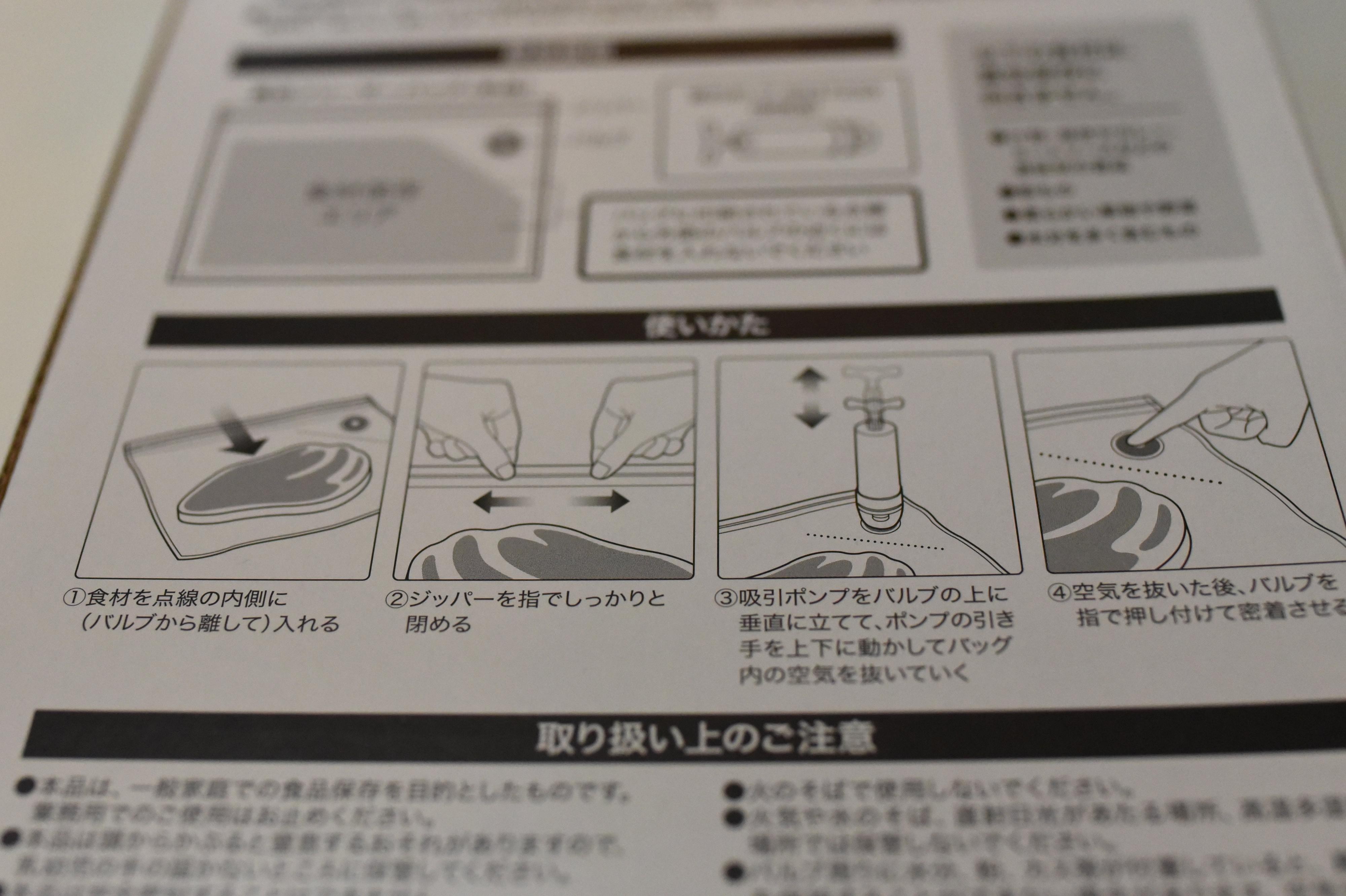 真空にする作業を行う前に、まずは真空フリーザーバッグの箱裏面を読んで、使い方と注意事項を確認しましょう。