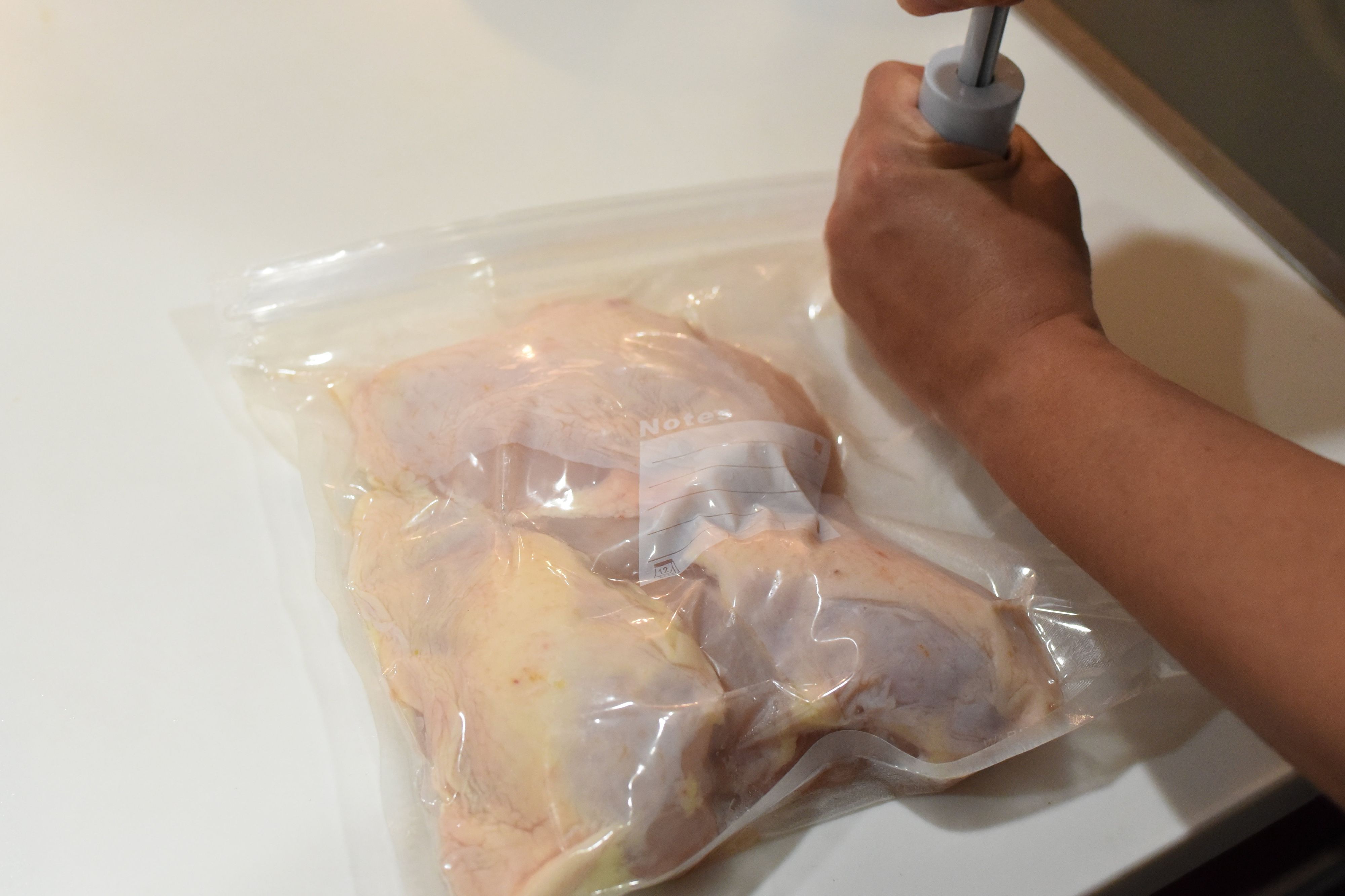 バッグ内の空気がぬけ、食材とバッグがピッタリとくっついたらオッケー。ポンプを離して、バルブを指で押し付けて密着させます。