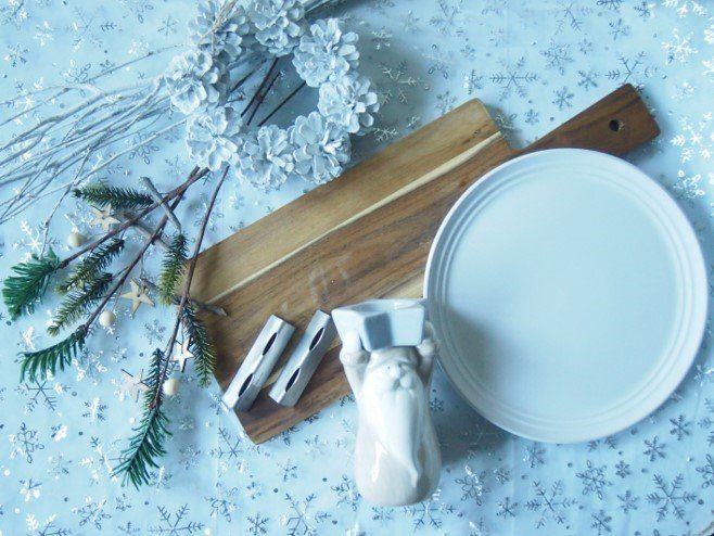 今回使うアイテムは、カトラリーレスト108円、アカシアまな板型トレー角ロング540円、アートフラワーモミ&ウッドスター108円、インテリアブランチwhite324円、Lienプレートwhite324円、松ぼっくりリースwhite540円、キャンドルカップ運ぶサンタ324円です。