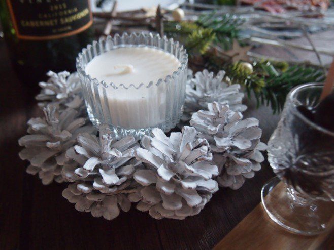 松ぼっくりのリースはキャンドルホルダーに。自然を感じるナチュラルな雰囲気にしたいのでぴったり。