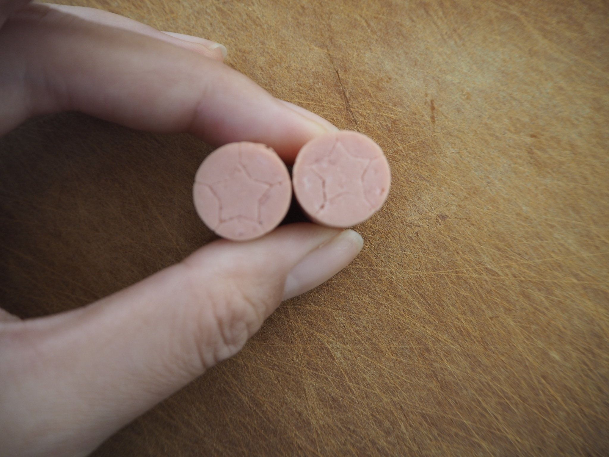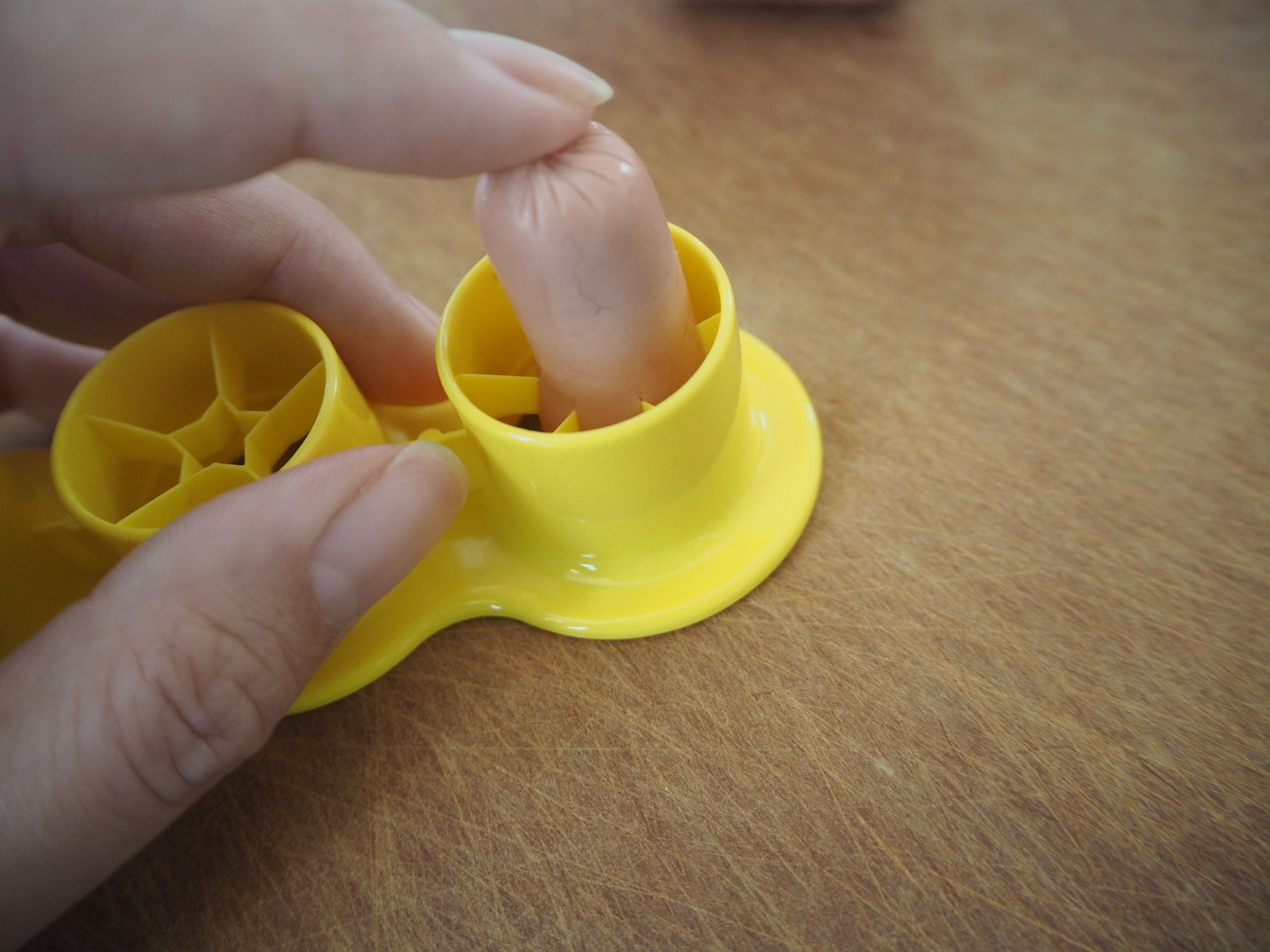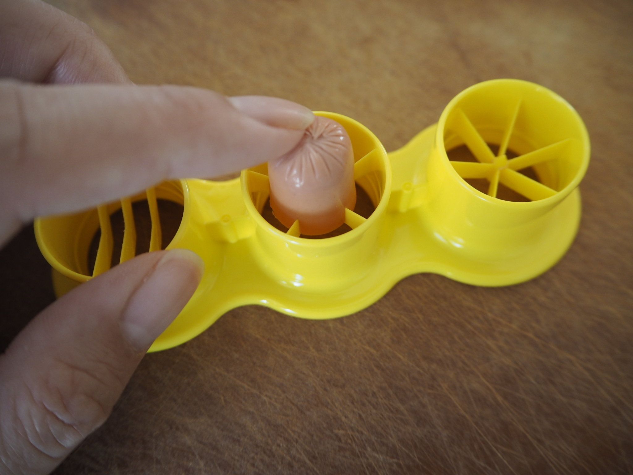 お花はウィンナーを半分に包丁でカットしたら黄色の型で押し付けて完成。