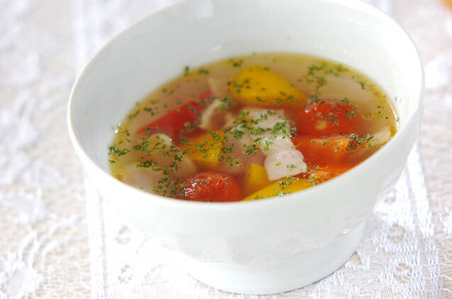 プチトマト独特の酸味と、パプリカの甘みがマッチしています。材料を切ってスープで煮るだけなので、野菜で何か一品料理が欲しいときにおすすめのレシピです。