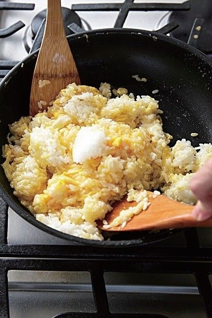 続けてサラダ油大さじ2を強火で熱し、1の溶き卵を流し入れてすぐに温かいご飯を卵の上にのせ、フライパンを動かさずに卵でご飯を包むように手早くほぐしながら炒める。