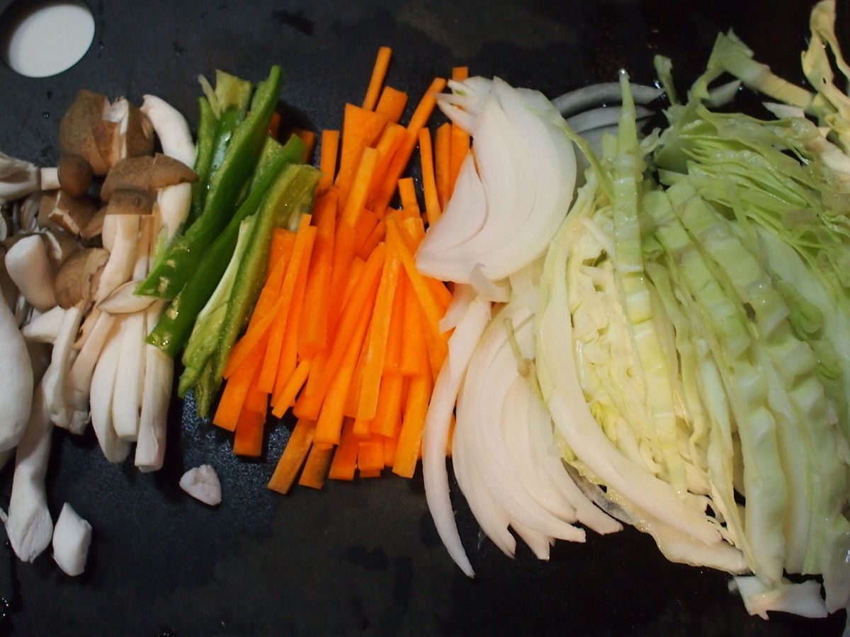 麺と絡みやすくするために、野菜などの具材は細長くカットするといいでしょう。細長いと、火も通りやすく一石二鳥。ただ、肉は細長くカットする必要はありません。ひと口大で大丈夫です。お好みのものでかまいません。今回は2人分でキャベツ1/8個、玉ねぎ1/8、人参1/3本、ピーマン1個、しめじ5本を細長くカットしました。