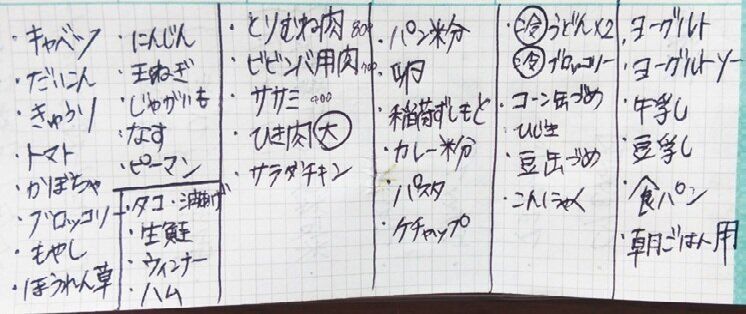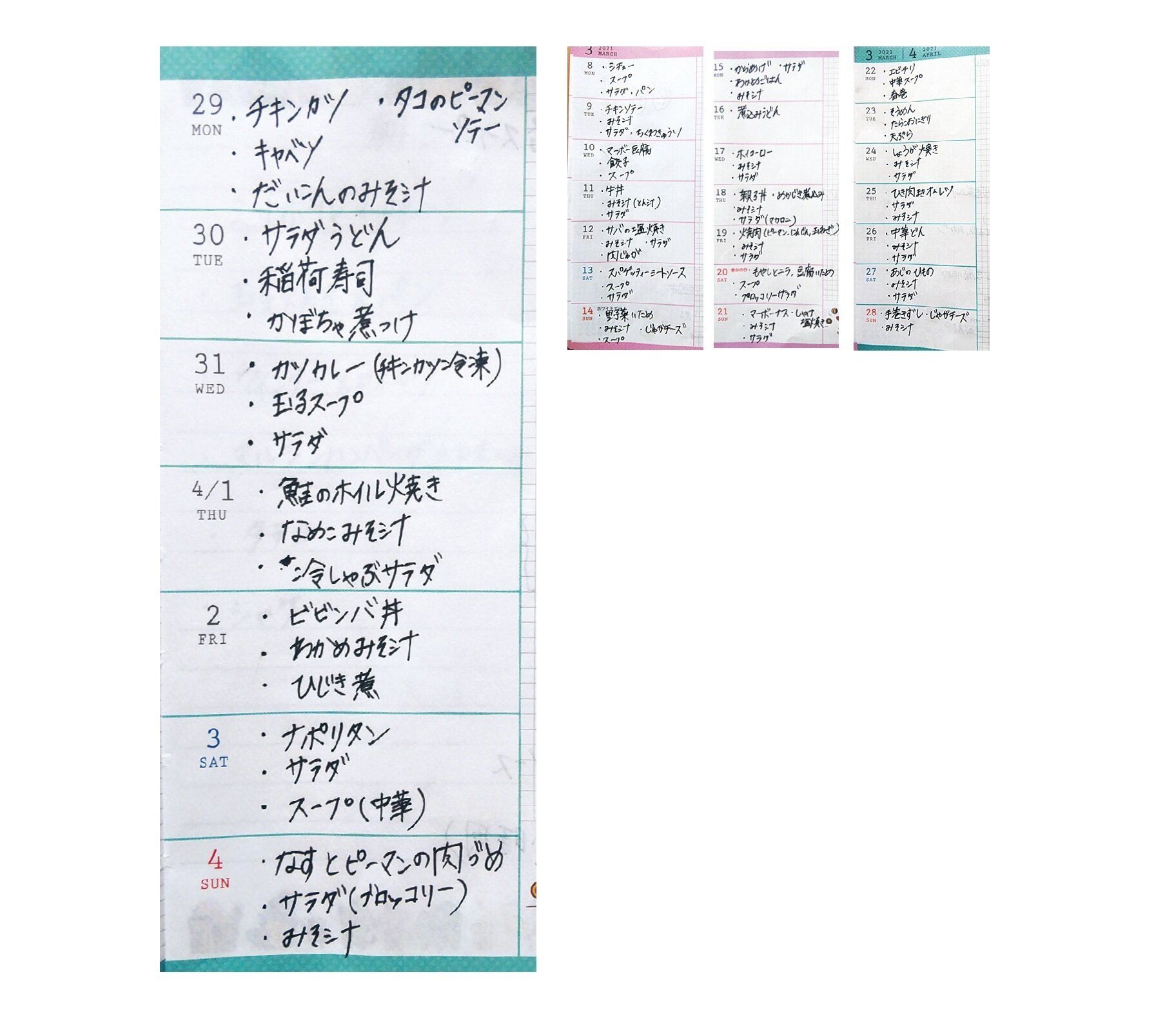 - 1週間分の献立4パターンを手帳にメモしていつも携帯