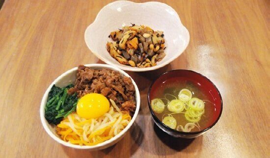 ビビンバ丼は子どもたちの大好物。ひき肉、野菜のナムルをご飯にのせ、卵の黄身をトッピング。