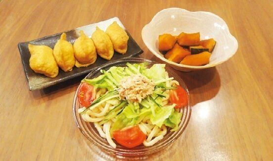 手早く作れて野菜もとれるサラダうどんに、いなりずしを合わせた「炭水化物祭り」で満足感アップ!