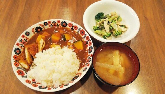 カレーにチキンカツとかぼちゃをトッピングし、栄養&食べ応え満点メニューに。卵スープはみそ汁に変更。