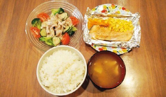 鮭はにんじんとコーンと一緒にホイル焼きに。魚がメインなので、副菜を肉入りの冷しゃぶサラダに。