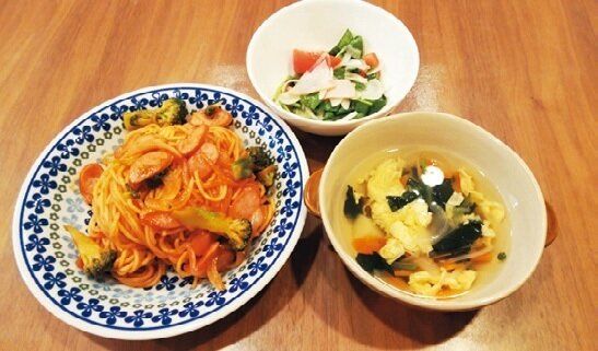 ナポリタン、サラダ、中華スープの具に、少しずつ残っている半端食材をバランスよく入れて使い切り。