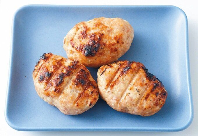 (1)ボウルにひき肉、[A]を入れ、粘りが出るまで混ぜ、3等分にし、厚さ1cmの平らなだ円形にまとめる。