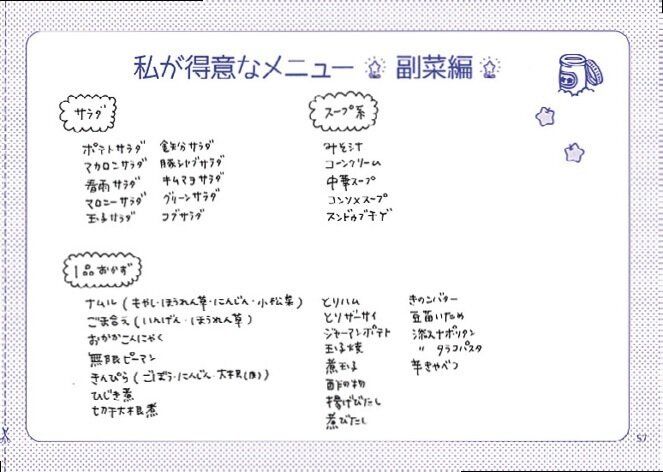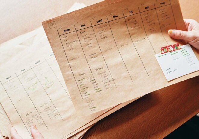 メニューが思い浮かばないときは、1年前の同じ時季の献立ノートを見返し、何を食べていたのか参考にします。副菜や汁ものはレパートリーをすべて書き出しておくのがおすすめ。組み合わせしだいで献立の幅が広がります。