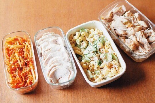 私の作り置きは、ゆでて火を通したり、材料を切って炒めたりするだけ。効率よくゆでる順序を考えたり、コンロと電子レンジを併用するのが時短のポイントです。週の後半に食べる作り置きは冷凍保存しておきます。