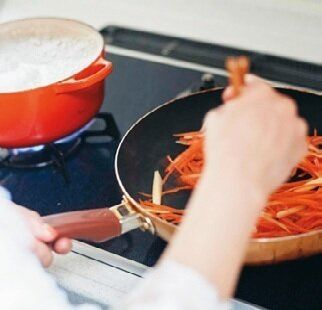マカロニをゆでている間に、根菜のきんぴらを炒め完成させる。ゆで汁は鍋にとっておく。