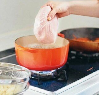 ゆで汁に耐熱ポリ袋に入れた鶏胸肉を入れて火を止め、さめるまで放置する間にサラダと鶏ザーサイを調味。
